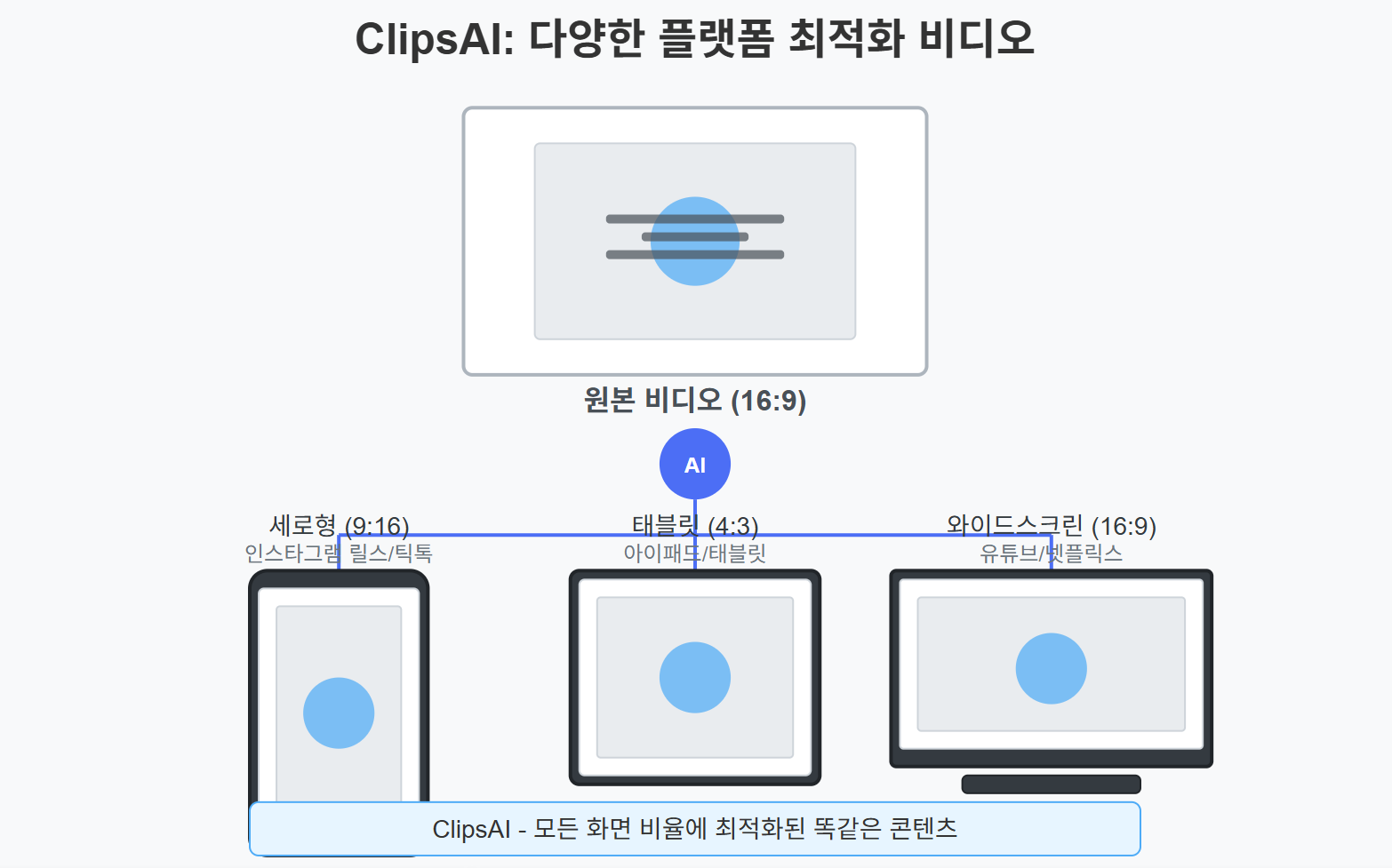 여러 소셜 미디어 플랫폼을 관리하는 콘텐츠 제작자들에게 ClipsAI는 비디오 포맷 변환에 소요되는 시간을 획기적으로 줄이면서도 품질 좋은 결과물을 보장합니다.
