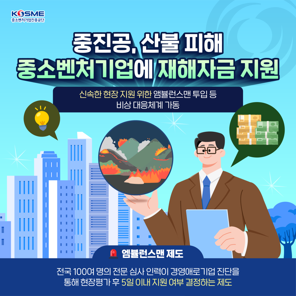 최근 경북, 경남, 울산 등지에서 발생한 대형 산불로 인해 많은 중소벤처기업이 큰 피해를 입었습니다. 이에 **중소벤처기업진흥공단(중진공)**은 신속한 지원을 위해 비상 대응체계를 가동하고 있습니다. ✊