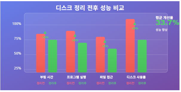 🔧 부팅 시간: 30% 단축 (평균 45초 → 32초) 🚀 프로그램 실행 속도: 25% 향상 📁 파일 접근 속도: 35% 개선 💾 디스크 사용률: 45% 감소