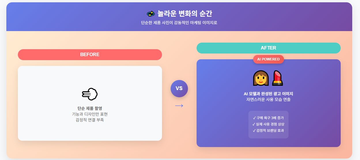 이 사례에서 볼 수 있듯이, 같은 제품이라도 AI 모델과 함께 연출된 이미지는 전환율을 3배 이상 향상시키는 효과를 보여줍니다.