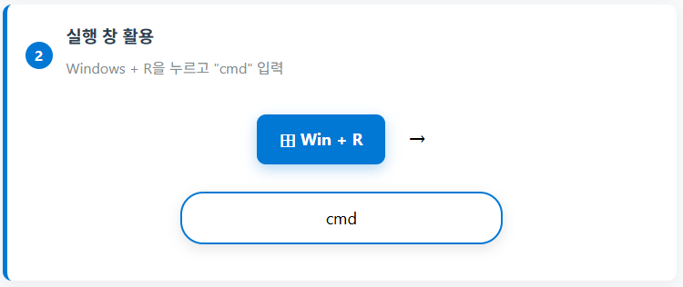 **CMD(Command Prompt)**는 윈도우에서 제공하는 명령줄 인터페이스입니다. 마우스 클릭 없이도 텍스트 명령어만으로 컴퓨터를 제어할 수 있는 강력한 도구죠.