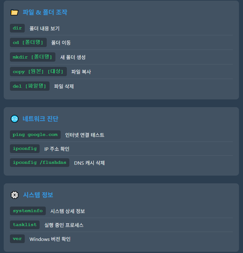 | 1 | dir | 폴더 내용 확인 | ⭐⭐⭐⭐⭐ |