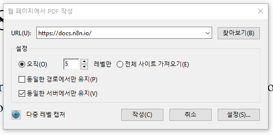 - 예를 들어, https://docs.n8n.io/guide/에서 PDF를 생성하려고 할 때, 이 옵션을 선택하면 https://docs.n8n.io/guide/ 하위의 페이지들만 가져옵니다.