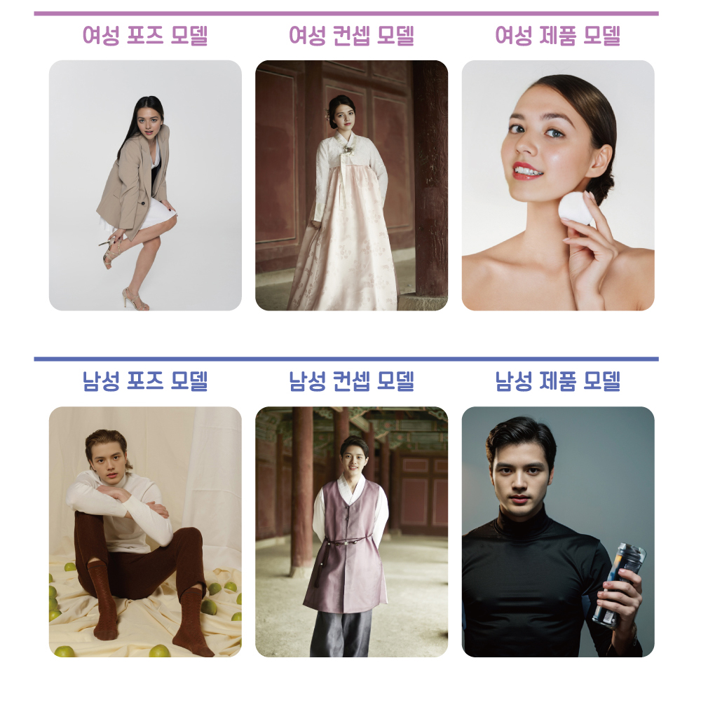 브랜드 콘셉트에 맞춘 여성/남성 포즈 모델, 컨셉 모델, 제품 모델까지 원하는 모든 이미지 스타일을 제공합니다.